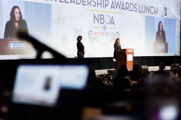 above: Previous recipients of the Ken White Distinguished Business Officer Award at the 2018 NBOA Annual Meeting, with Carney at center, NBOA Board Chair Tracey Fudge (far left) and President and CEO Jeff Shields (far right).