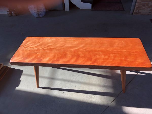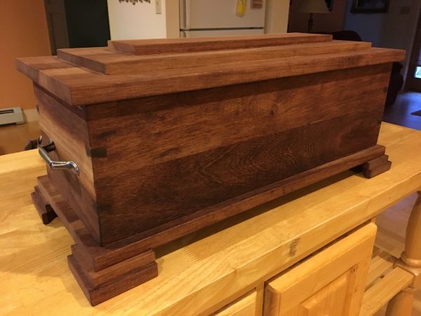 A coffin for five dogs. “My wife’s sister is into show dogs. Three of her five dogs have passed away. She had them cremated, but wanted something to keep them in. The wood is mahogany. I added a piano hinge and handles. She has it in her living room now, and it looks like a storage chest.”