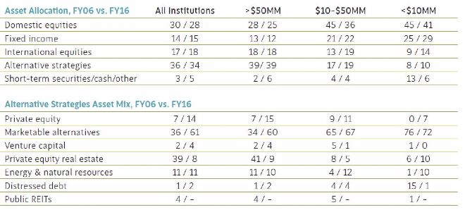 One strategy for winning this battle is for schools to change their endowment’s asset allocation. Over the past 10 years, schools’ overall mix of asset classes has shifted, primarily among smaller endowments. Alternative strategies have become more popular with schools whose endowments are $50 million or less. The table below shows the shifts between 2006 and 2016.