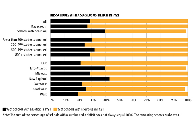 Day schools, schools with 300-499 students enrolled, and schools in the East (New Jersey, New York), Southeast, Southwest and West regions fared particularly well, with at least 72% of schools ending the 2021 fiscal year with a surplus.