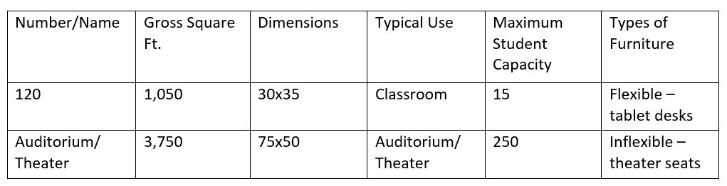 To understand the quantity of net assignable (i.e., programmatic) space versus gross space (i.e., total exterior footprint of buildings) and how much of net assignable space is currently dedicated to different types of programming, develop an inventory. Categorize spaces using the following column categories: