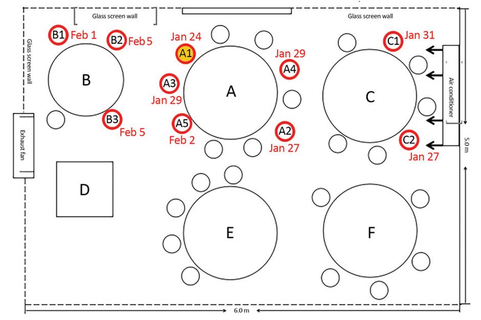 Another consideration is the relative location of each desk to the HVAC return vent. These vents are often located in the ceiling or upper wall of a space, and draw all circulating air through a relatively small opening to be re-conditioned and circulated back into the space. A study from a restaurant in Wuhan, China, has shown that proximity to a return vent could increase a person’s chance of getting infected if someone further “upstream” in the room is infected and releasing contaminated droplets into the air. We therefore recommend identifying the location of each return vent in a room and configuring the space so no one is seated directly below or next to that vent.