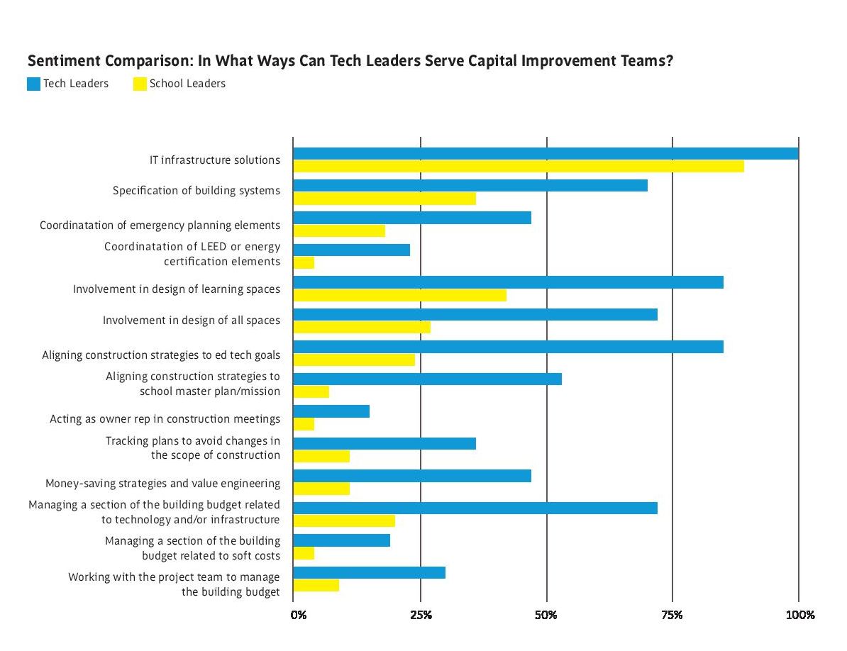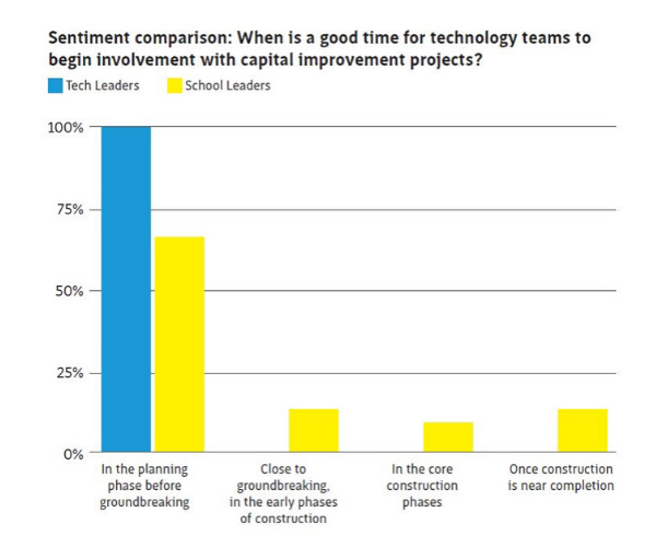 Meanwhile, 100% of tech leaders said they wanted to be involved before groundbreaking. This compares to 66% of school leaders more generally who believe tech leaders should be involved from the get-go (See graph). Furlong’s cautionary note about involving a tech leader is to ensure the individual has sufficient time and capacity for involvement. “I think [the tech leader] has to have a mindset that this is a priority for [their] work,” said Furlong.