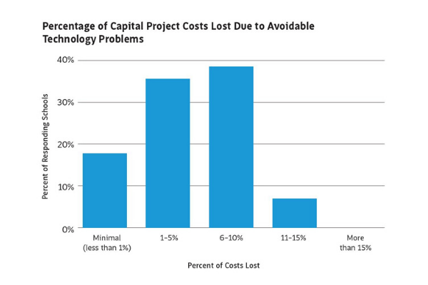 Recent research from the Association of Technology Leaders in Independent Schools (ATLIS) shows the value of technology leaders’ early involvement. Responses from 50 independent school employees were collected in fall 2019. Of the technology leaders surveyed, nearly 60% said scope changes to a capital improvement project at their school could have been avoided with earlier involvement of the tech team. Some of these changes were relatively minimal, but nearly 40% indicated that 6-10% of total project value was lost due to avoidable technology problems. (See graph).