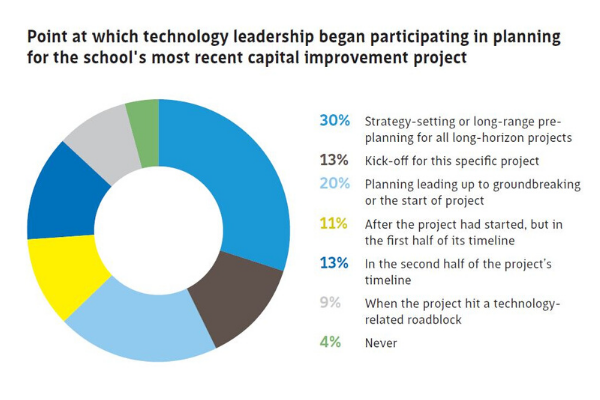 More than 60% of survey respondents reported that technology teams were brought into the capital improvement project before groundbreaking. The remainder reported being incorporated after groundbreaking, with 4% saying the technology team was not involved at any point in the school’s most recent project.