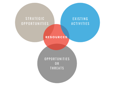 The existing resources circle intersects all the other circles. Chances are it will be the smallest circle and the least likely to grow. So when trustees add a meritorious idea to any of the other categories without adding any resources, the board can easily see and visualize the pressure placed on its current resources. This offers business officers, heads of school and CEOs an opportunity to conserve their voice; the image speaks for itself. It should lead board members to the rarely asked question, “If we are going to add that, then what comes off the table?”