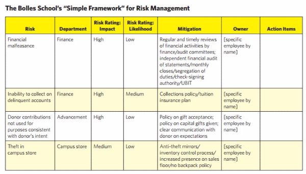 Schools can also decide which risks they don’t want to take on, and, on the positive side, which risks they will tolerate because the programs or initiatives associated with those risks add value. “Ask, what’s the risk if we don’t do this?” Abraham says. “Great schools look at both the opportunities and the things that can go wrong. It’s being able to balance both of those.”