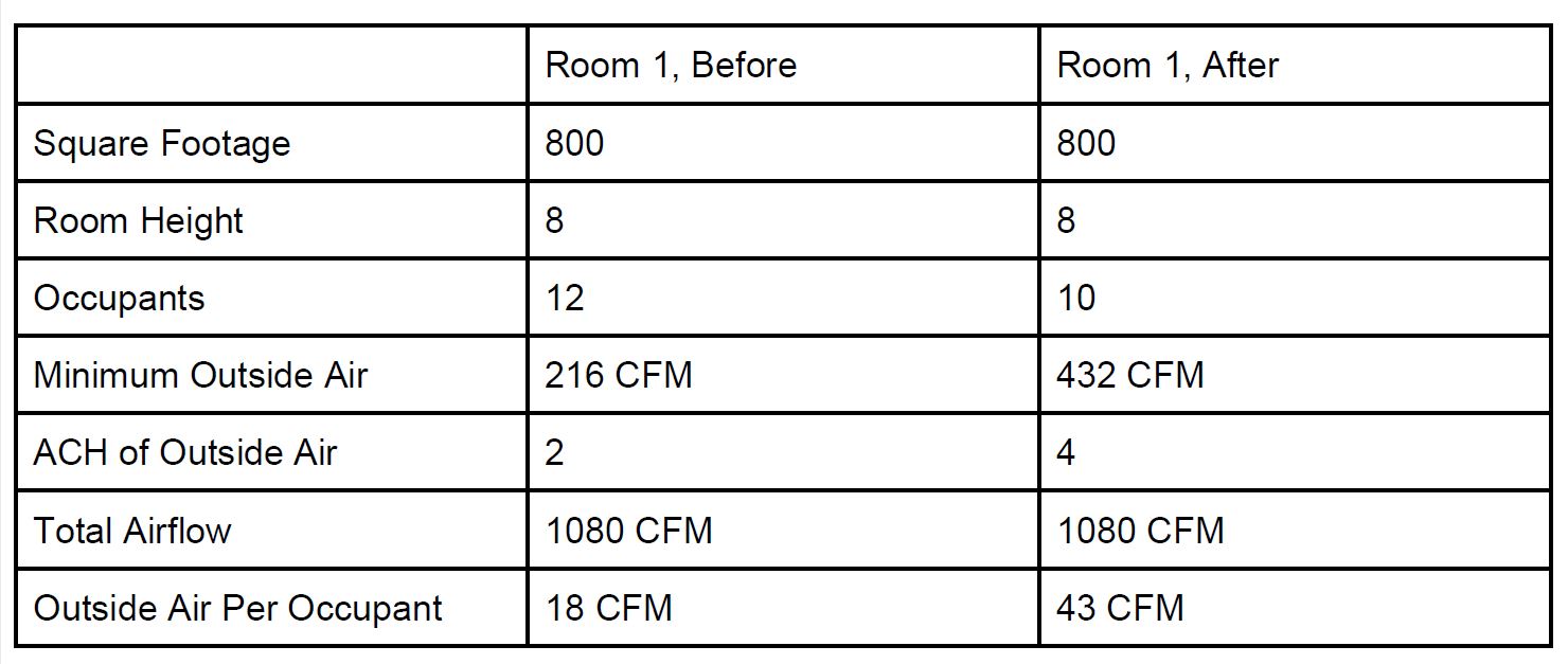 Doubling the outside air quantity doubles the air changes per hour of fresh air. It should also be noted that we can effectively increase outside air per person by limiting space density.