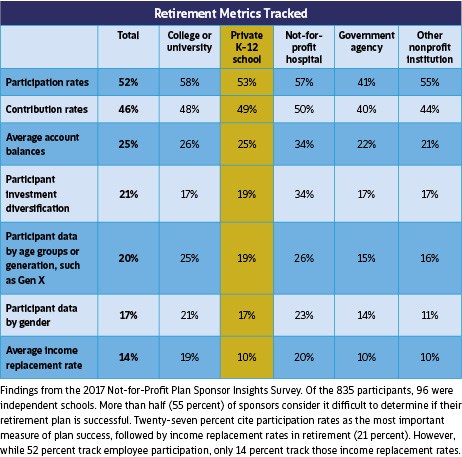 Schools also want to know how their employees are doing with their retirement planning — is the plan succeeding? Retirement plans have many moving parts, and it’s not surprising that 50 percent of independent school plan sponsors surveyed find it challenging to measure the success of their retirement plans. Here’s what they consider their plan’s most important success measures: