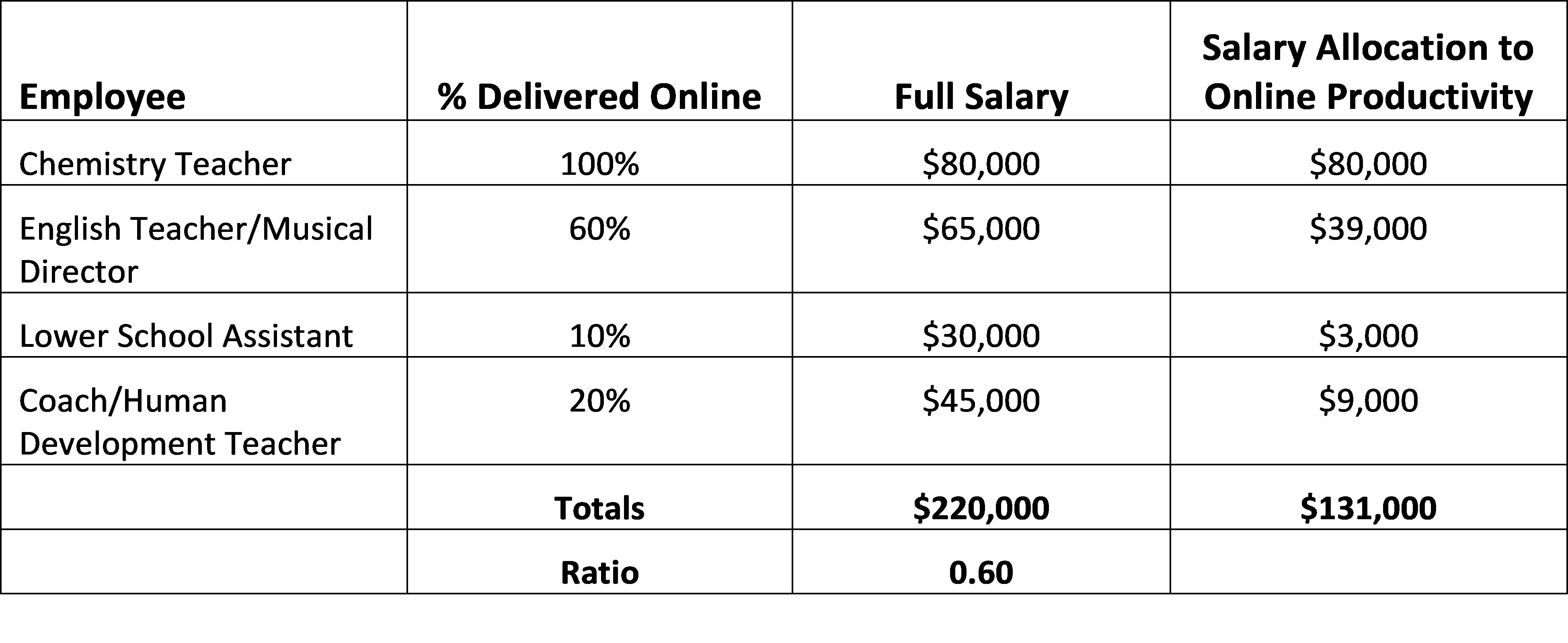 Follow the money. What percentage of your faculty compensation supports work outside the core academic program? This is difficult to calculate because many teachers have multiple roles, which could include teaching two sections of English and directing the spring musical or teaching math and coaching lacrosse. Make a spreadsheet of all academic employees and for each ask, “What percentage of their job have they been able to do in a 100% online environment?” See the example at right.