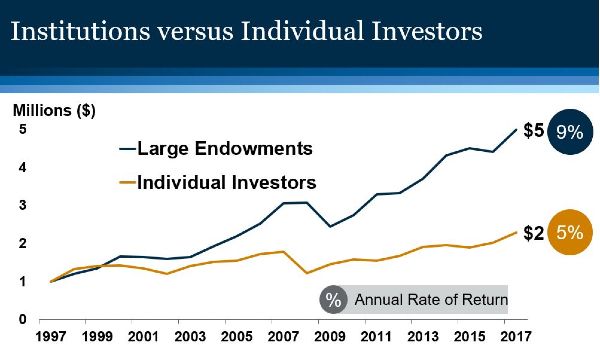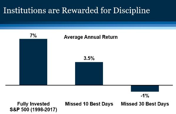 “If you analyze previous volatile periods, even huge intra-year dips of 10 to 14 percent, you’ll most often find at the end of year that the market has still made money,” Snyder said. Investors would need a “crystal ball” to predict not only when to pull out of the market, but also when to put the money back in to avoid significant losses. In comparing longitudinal returns from retail funds and institutional funds, Commonfund has found that institutions do significantly better, largely thanks to clear guidance that prevents emotional decision-making, said Snyder.