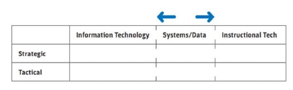 I arrived at this framework because educational technology no longer neatly fits into the two halves of IT and instructional. However, for the sake of executive management, it’s useful to maintain a compartmentalized structure. The arrows and dashed lines symbolize the ever-expanding systems area; today few technologies are purely IT or instructional.