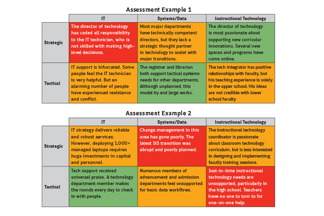 The simple matrix below shows what I use when consulting with schools. The idea is to divide technology services into three functional areas, and assess each area through both a strategic and tactical lens. The simplicity of this approach resonates with leadership teams struggling to aggregate disparate observations into high-level conclusions. This model also works for departments of any size.