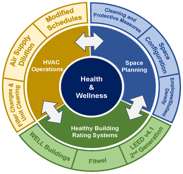 The three pillars of sustainability can be seen in the following graphic: HVAC operations, space planning and health building rating system. The COVID-19 pandemic has placed a new emphasis on health and wellness in our school buildings. Most immediately, healthy buildings begin with short-term HVAC Operations and space planning strategies that support their reopening plan this fall. These efforts can be extended with healthy building rating systems.