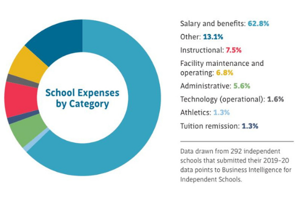 Net tuition and fees continue to be the primary source of income for independent schools — 75.4% of revenue, increasing from 72% in 2018-19. The percentage of revenue drawn from the endowment and surplus funds increased from 5.9% in 2018-19 to 6.9% in 2019-20. The proportion of revenue from interest and investment income decreased from 3.2% to 1.9%. Auxiliary income decreased from 5.6% to 4.3% of revenue.