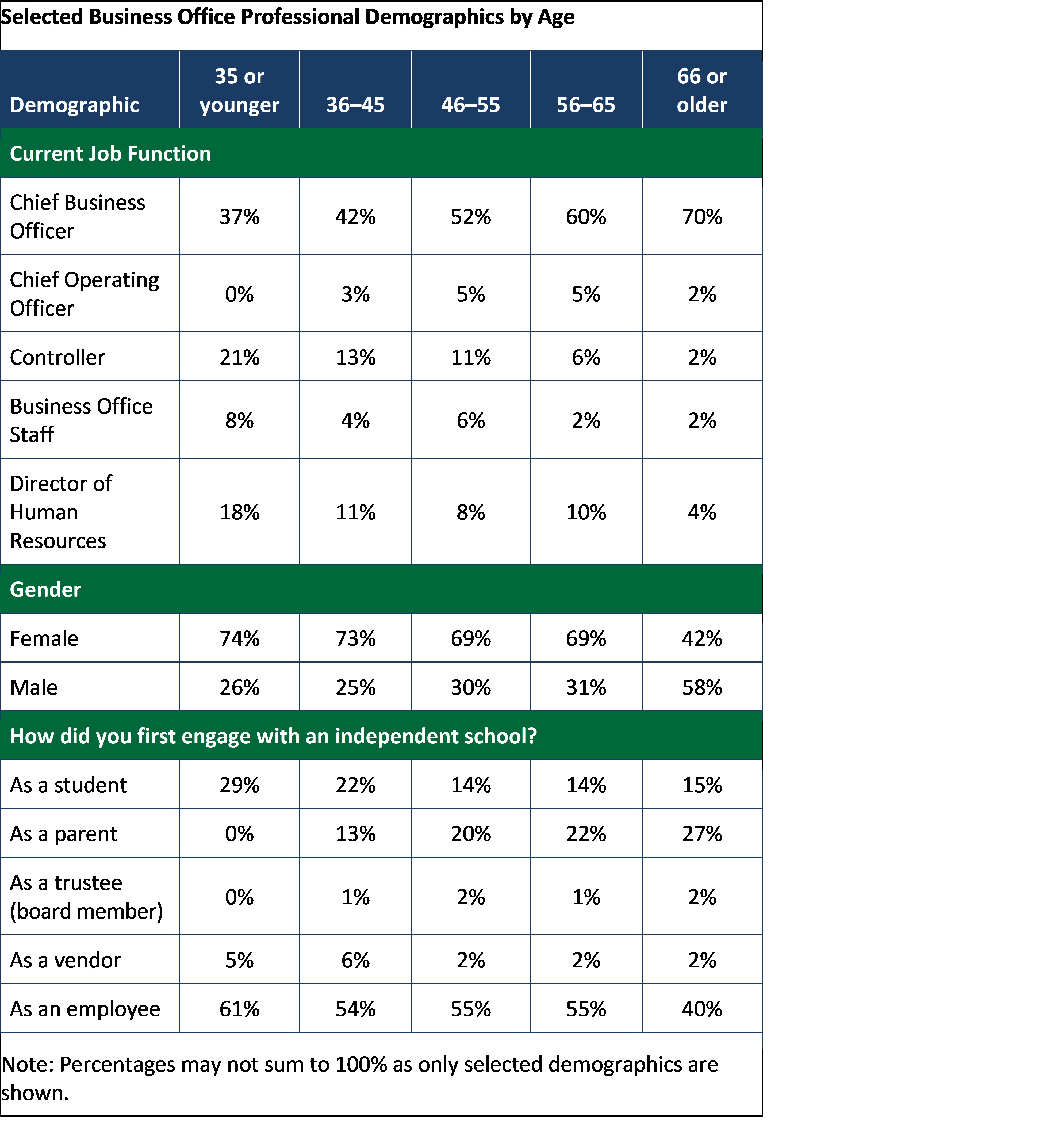 The fact that most business office professionals are 45 or older is not surprising. Roles like chief business officer or chief operating officer are important leadership positions for which schools need experienced staff, and experience is equated with age. It’s difficult for young people to figure out how to get the experience needed to take on these roles. More well-defined career trajectories in the business office could show young professionals what other positions would give them the experience that may lead to a CFO or COO role. Since young business office professionals are more likely to have first engaged with independent schools as a student, there is potential for schools to grow their own staff who are already bought into the school’s mission and culture.