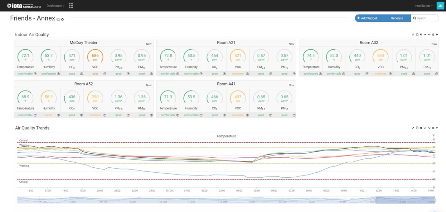 The indoor air quality sensors monitor room temperature, humidity, CO2 concentration and particulate matter (PM) concentration, among other metrics. All data led into IotaComm’s user friendly web-based dashboard.